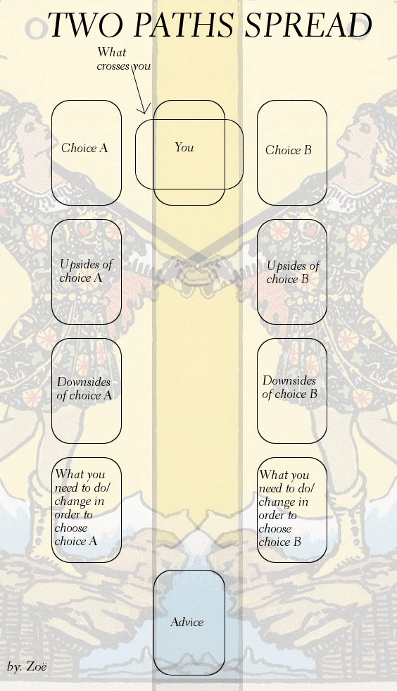 ALWAYS nice to have a new tarot spread! As tarot reader I often get asked “what will happen I choose path B instead of A” This a great spread to do for friends, or for clients! Nicely done!