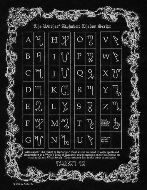 Also called ‘’The Runes of Henorius’’, these letters are used to write spells and incantations in a ‘’Book of Shadows’’, and to inscribe one’s Craft name on ritual tools and Witch jewels. Their origin is lost in the mists of antiquity.