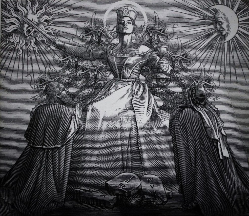 Now that we have established the separate identities of Babalon and Eisheth Zenunim, we may begin to consider the connections between them, and even the possibility that these two are one. To do this, we must first return to the Zohar. Here Eisheth Zenunim is described in terms which must seem familiar to anyone who has read Revelations. As mentioned before, she is called the “End of all Flesh” and the “end of days,” an easy parallel with the whore of the apocalypse. She is described as clad in purple and richly bejeweled, with red hair and a beautiful face. “On her neck hang all the powers of Eastern lands… her speech as smooth as oil; and her lips as beautiful and red as a rose… she is sweeter than all that is sweet in the world.” She is described, like Babylon the Great, as seducing men with wine and fornication. Like Babylon, she is a richly adorned harlot bedazzled with the attributes of sovereignty, wielding the power to bring men and nations to their knees. And like Babylon in Revelations, she brings destruction in her wake: once she has lulled her victim into sleep with wine and rutting, she takes off her ornaments, clothes herself in flames, and returns wielding an envenomed sword with which to end his life.[20]